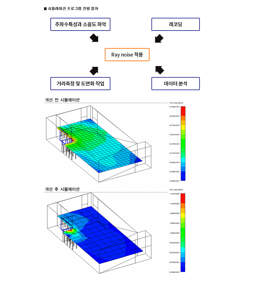 소음 시뮬레이션 프로그램은 공학적 개선안을 수립하여 적용하고자 하는 경우에 있어서 밀폐범위, 차폐부분, 흡음재 종류 등에 따른 개선 후의 효과를 미리 예측해 보는데 있어서 매우 유용한 프로그램이다.